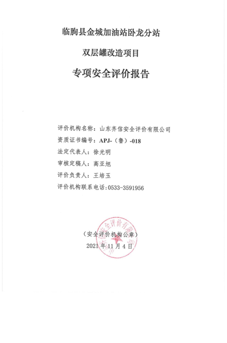 | 臨朐縣金城加油站臥龍分站雙層罐改造項目專項安全評價報告 |