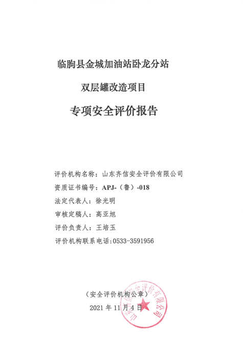 | 臨朐縣金城加油站臥龍分站雙層罐改造項目專項安全評價報告項目 |