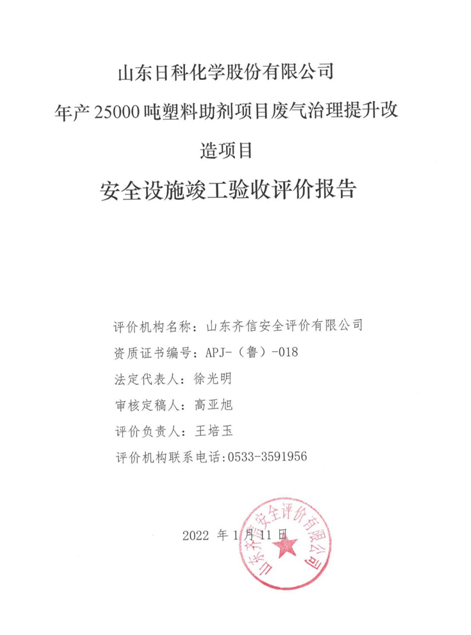 | 山東日科化學(xué)股份有限公司年產(chǎn)25000噸塑料助劑項(xiàng)目廢氣治理提升改造項(xiàng)目安全設(shè)施竣工驗(yàn)收評(píng)價(jià)報(bào)告 |