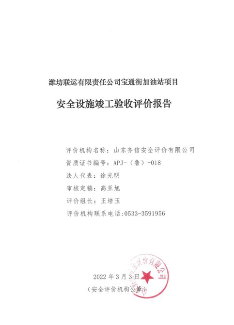 | 濰坊聯(lián)運(yùn)有限責(zé)任公司寶通街加油站項(xiàng)目安全設(shè)施竣工驗(yàn)收評價(jià)報(bào)告 |