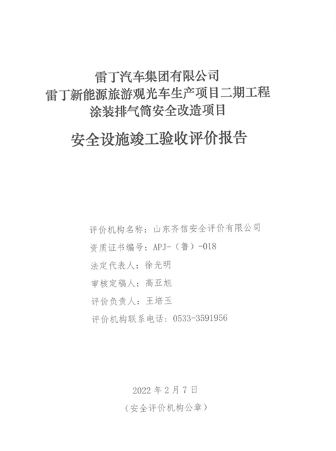 | 雷丁汽車集團(tuán)有限公司雷丁新能源旅游觀光車生產(chǎn)項(xiàng)目二期工程涂裝排氣筒安全改造項(xiàng)目安全設(shè)施竣工驗(yàn)收評(píng)價(jià)報(bào)告 |