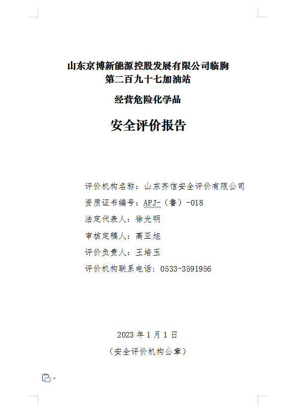 | 山東京博新能源控股發(fā)展有限公司臨朐第二百九十七加油站經(jīng)營危險化學(xué)品項目安全現(xiàn)狀評價報告 |