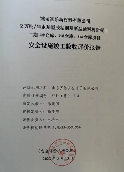 | 濰坊富樂新材料有限公司 2萬噸/年水基型膠粘劑及新型涂料樹脂項(xiàng)目二期4#倉庫、5#倉庫、6#倉庫項(xiàng)目安全設(shè)施竣工驗(yàn)收評價(jià)報(bào)告 |