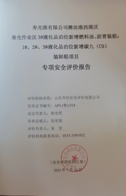 | 壽光港有限公司濰坊港西港區(qū) 壽光作業(yè)區(qū)3#液化品泊位新增燃料油、瀝青裝船;1#、2#、3#液化品泊位新增碳九(C9)裝卸船項(xiàng)目專項(xiàng)安全評(píng)價(jià)報(bào)告 |