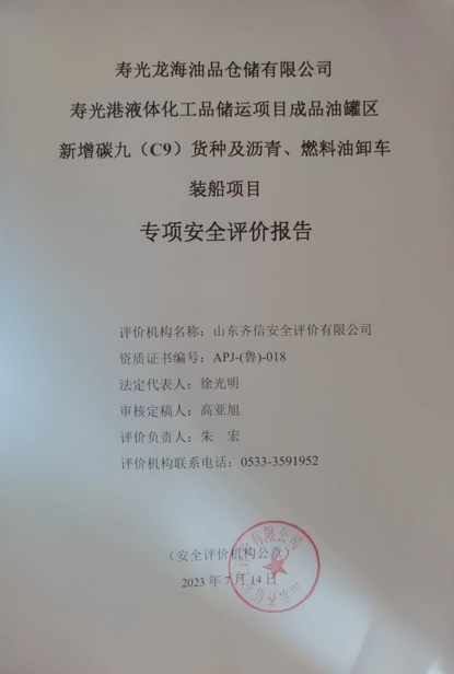 | 壽光龍海油品倉儲(chǔ)有限公司壽光港液體化工品儲(chǔ)運(yùn)項(xiàng)目成品油罐區(qū)新增碳九(C9)貨種及瀝青、燃料油卸車裝船項(xiàng)目專項(xiàng)安全評(píng)價(jià)報(bào)告 |