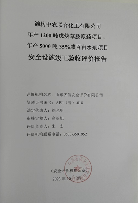 | 濰坊中農(nóng)聯(lián)合化工有限公司 年產(chǎn)1200噸戊炔草胺原藥項(xiàng)目、 年產(chǎn)5000噸35%威百畝水劑項(xiàng)目 安全設(shè)施竣工驗(yàn)收評(píng)價(jià)報(bào)告 |