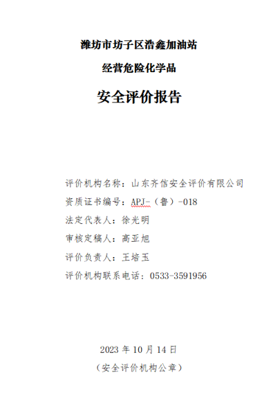 | 濰坊市坊子區(qū)浩鑫加油站經營危險化學品項目安全現狀評價報告 |