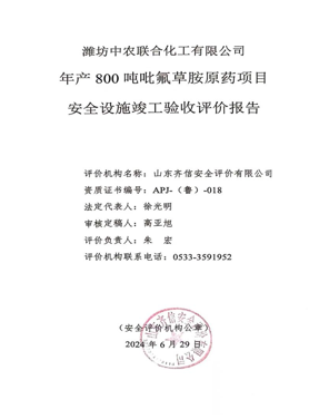 | 濰坊中農(nóng)聯(lián)合化工有限公司年產(chǎn)800噸吡氟草胺項(xiàng)目 安全設(shè)施竣工驗(yàn)收評價(jià)報(bào)告 |