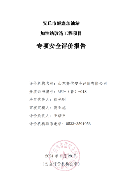 | 安丘市盛鑫加油站 加油站改造工程專項(xiàng)安全評(píng)價(jià)報(bào)告 |