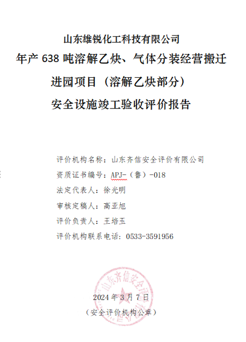 | 山東雄銳化工科技有限公司 年產(chǎn)638噸溶解乙炔、氣體分裝經(jīng)營搬遷進園項目(溶解乙炔部分)安全設(shè)施竣工驗收評價報告 |