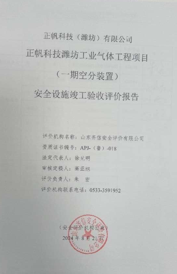 | 正帆科技(濰坊)有限公司正帆科技濰坊工業(yè)氣體工程項(xiàng)目(一期空分裝置)安全設(shè)施竣工驗(yàn)收評(píng)價(jià)報(bào)告 |